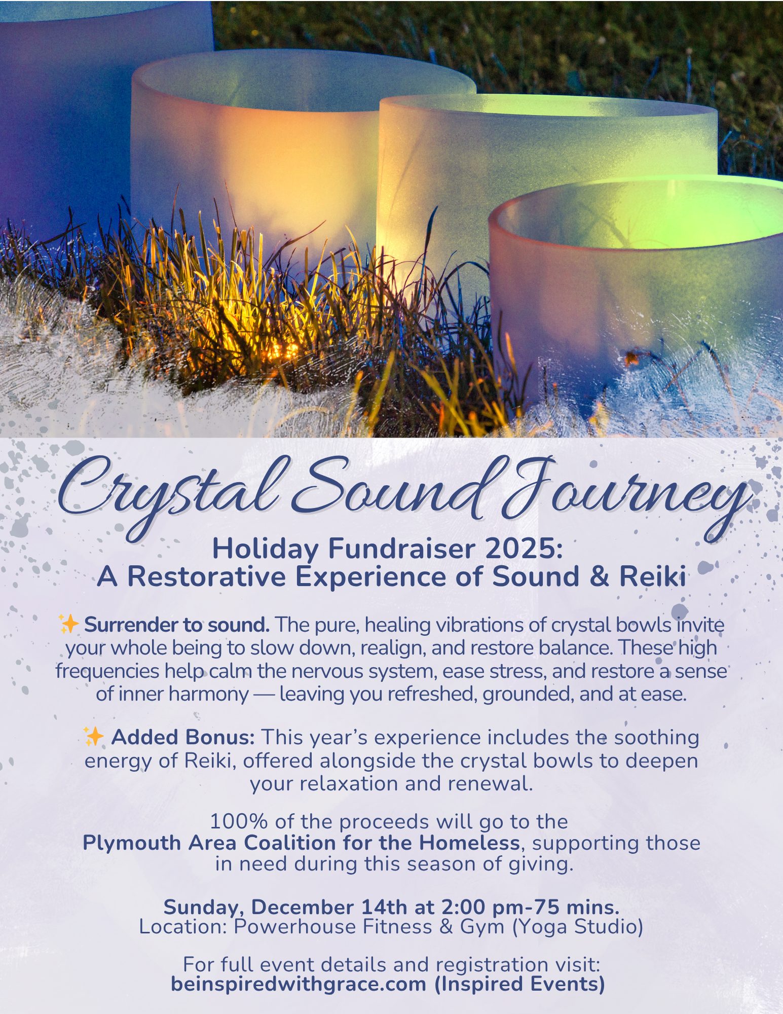 Powerhouse Gym & Fitness 7 Herring Pond Rd., Plymouth, MA, United StatesRestore & Recover Every year, I love finding a way to give back—and this gathering is the perfect way to do both: nurture yourself and support our community. It’s truly a win–win. Join us for an afternoon of gentle bliss with Den, a gifted Reiki Master, and Jeanne, an accomplished crystal bowl practitioner. Together, we’ll […]