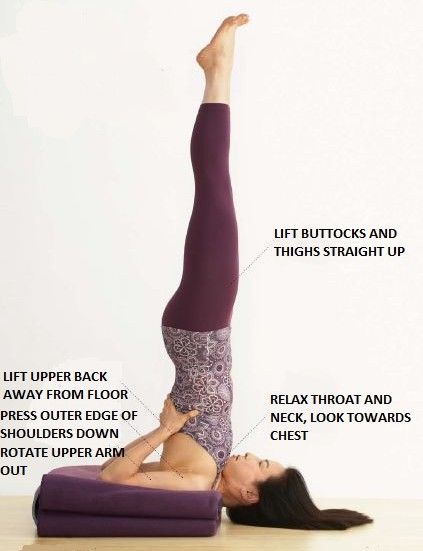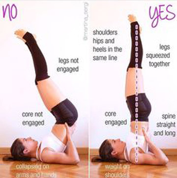 In Shoulderstand it is important the body aligns in a vertical line (“yes” in picture 1). I tell my students to image the entire back of their body up against a wall. The ankles, knees, hips and shoulder line up with one another. Your hands are supporting your back, with fingers facing inwards toward the spine. The shoulders blades are squeezing together and the back of the arms helps create a trapezoid base. The core and leg muscles are all engaged. Energetically your reaching your toes towards the ceiling.